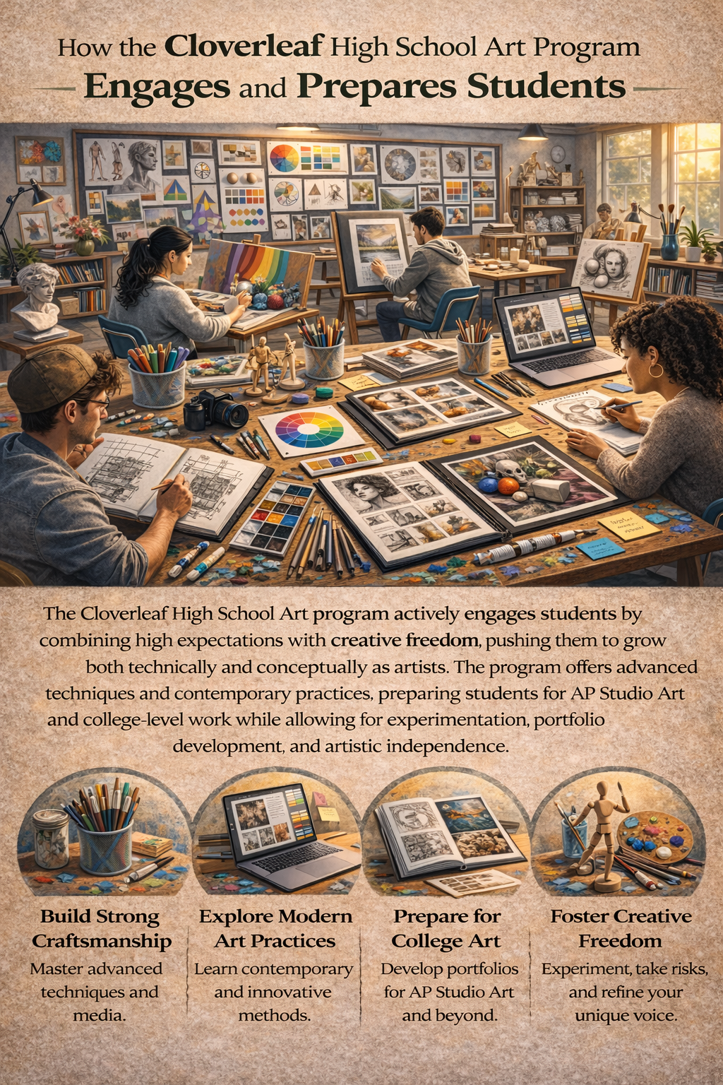 Welcome to a rigorous and rewarding creative experience designed to challenge, refine, and elevate your artistic practice. The Advanced Art program at Cloverleaf High School is more than a class—it is an immersive studio environment where discipline meets imagination and creativity is cultivated with intention. High school is a pivotal time for artistic growth. In this program, you will strengthen your technical abilities, deepen your conceptual thinking, and begin shaping a cohesive body of work that reflects both your voice and your vision.