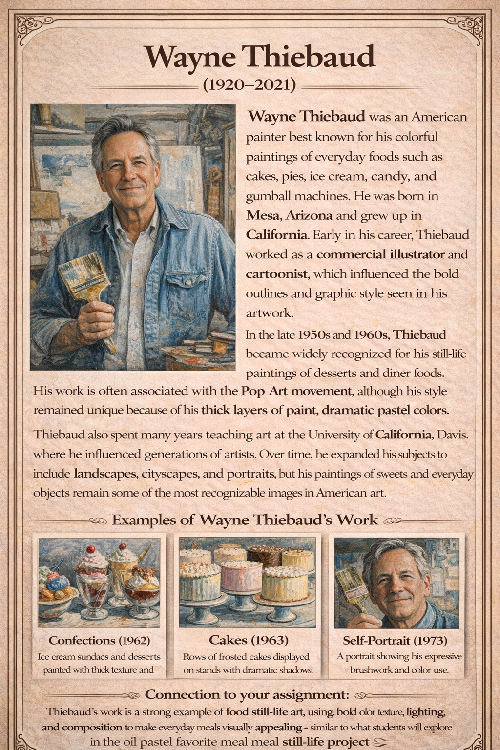 In this advanced oil pastel assignment, students will create a still life drawing of their all-time favorite meal, imagining it as the final meal they would ever have. The focus is on observation, composition, texture, and color, as well as capturing the mood and personal significance of the meal. Students are encouraged to photograph their meal from an interesting angle—such as a close-up, overhead, or dramatic foreshortening—to create a dynamic composition for their drawing.