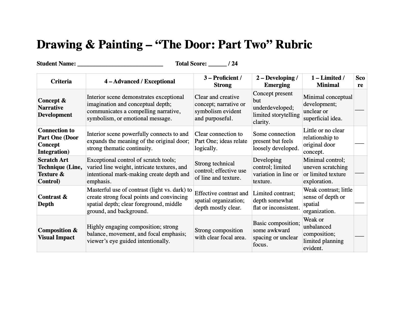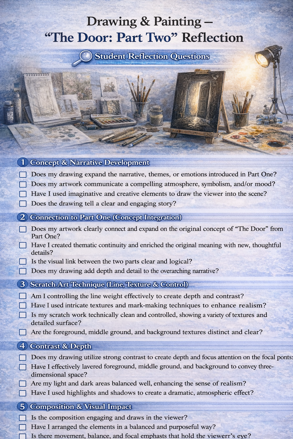 For Part Two of the “The Door” assignment, students will reveal what is inside the door using scratch art techniques. Building on the door created in Part One, this project encourages imagination, storytelling, and expressive mark-making. Students will explore texture, contrast, and line work as they uncover a hidden world or scene behind the door. This assignment emphasizes creativity, narrative development, and technical skill with scratch art tools while continuing the conceptual thread from Part One.