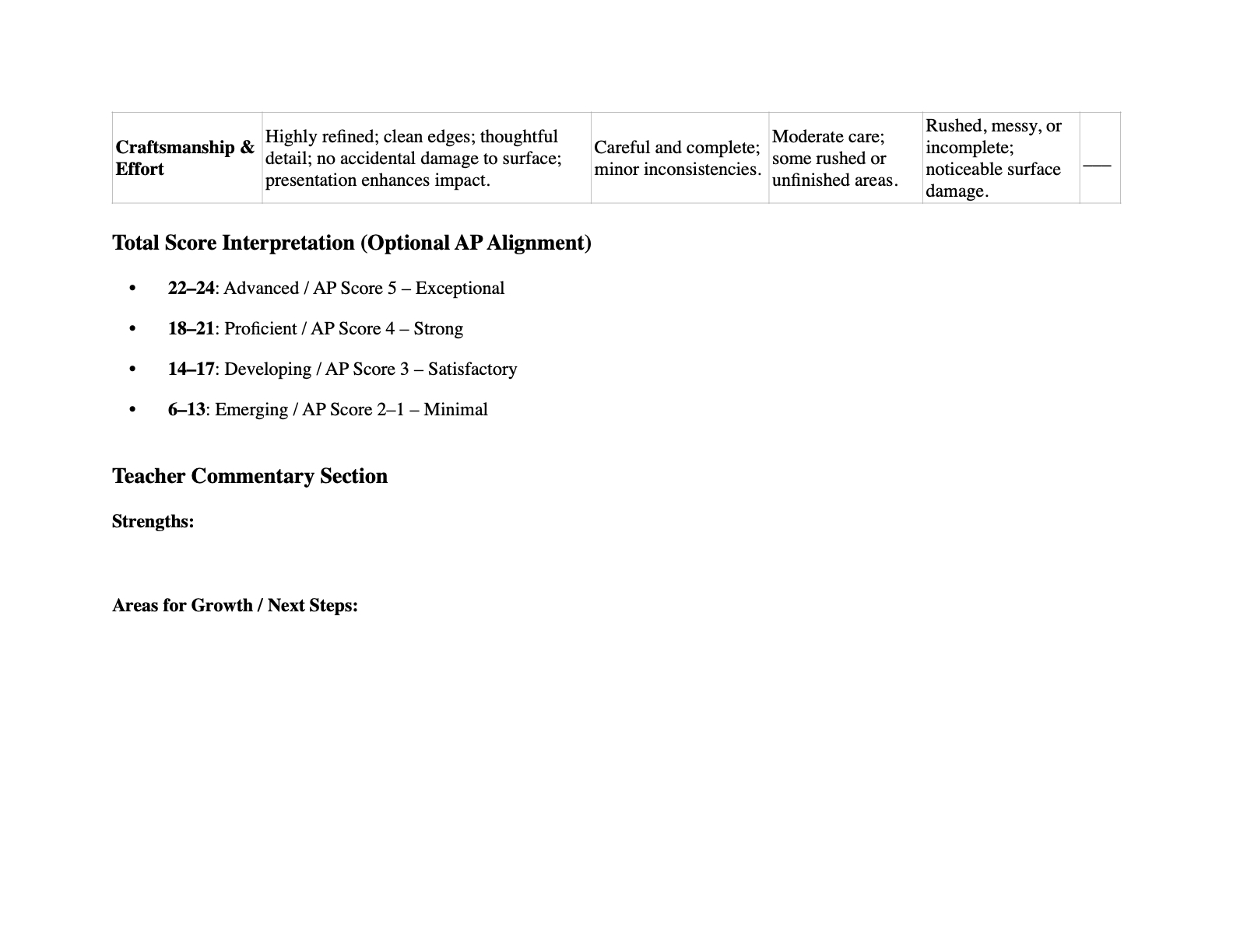 Students demonstrate quality craftsmanship through careful selection, handling, and care of art materials and tools.