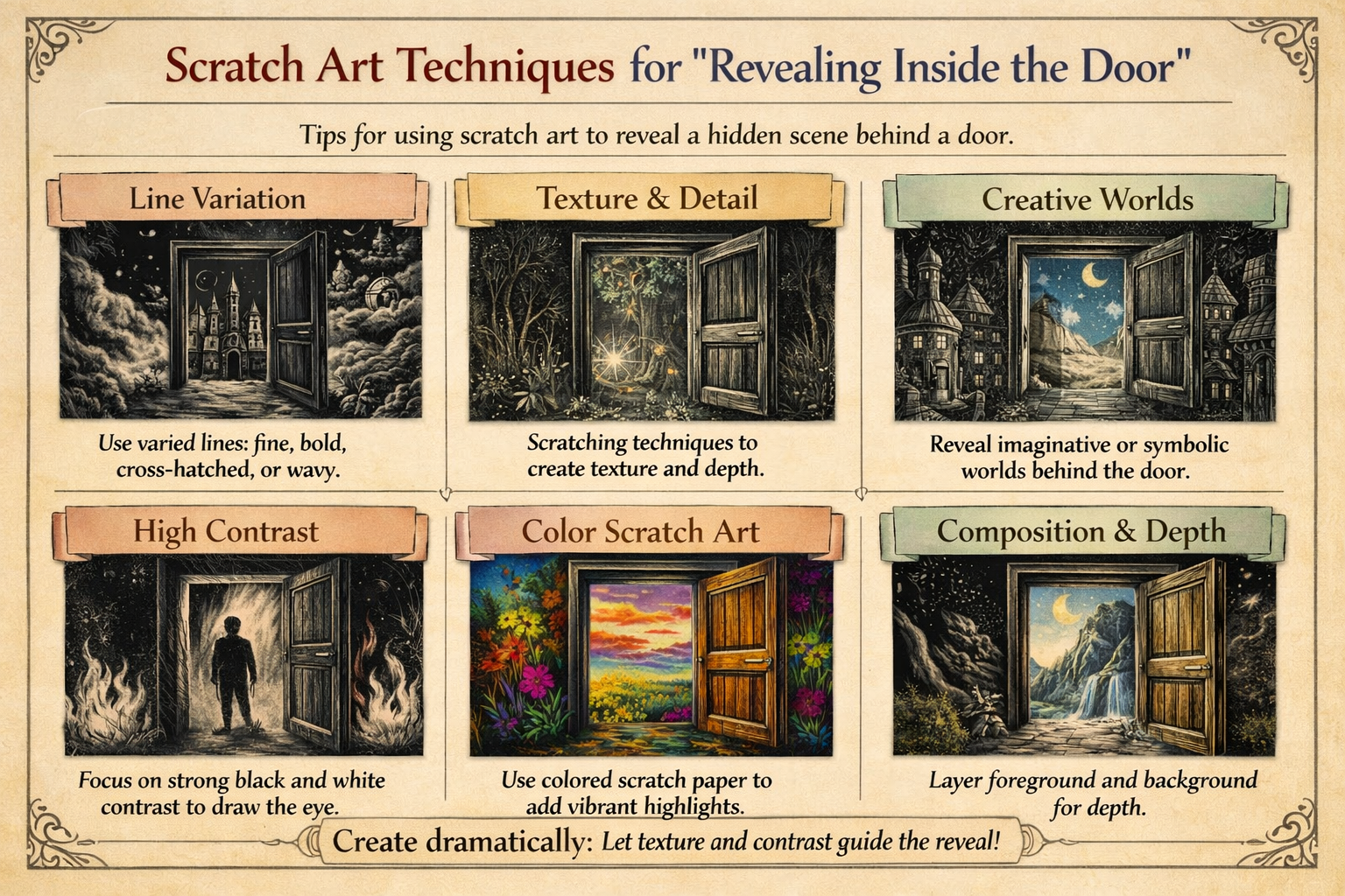 Think of the door as a portal to another world. What story, emotion, or idea is waiting behind it? How can contrast, texture, and line guide the viewer’s eye and create depth in your scratch art scene?