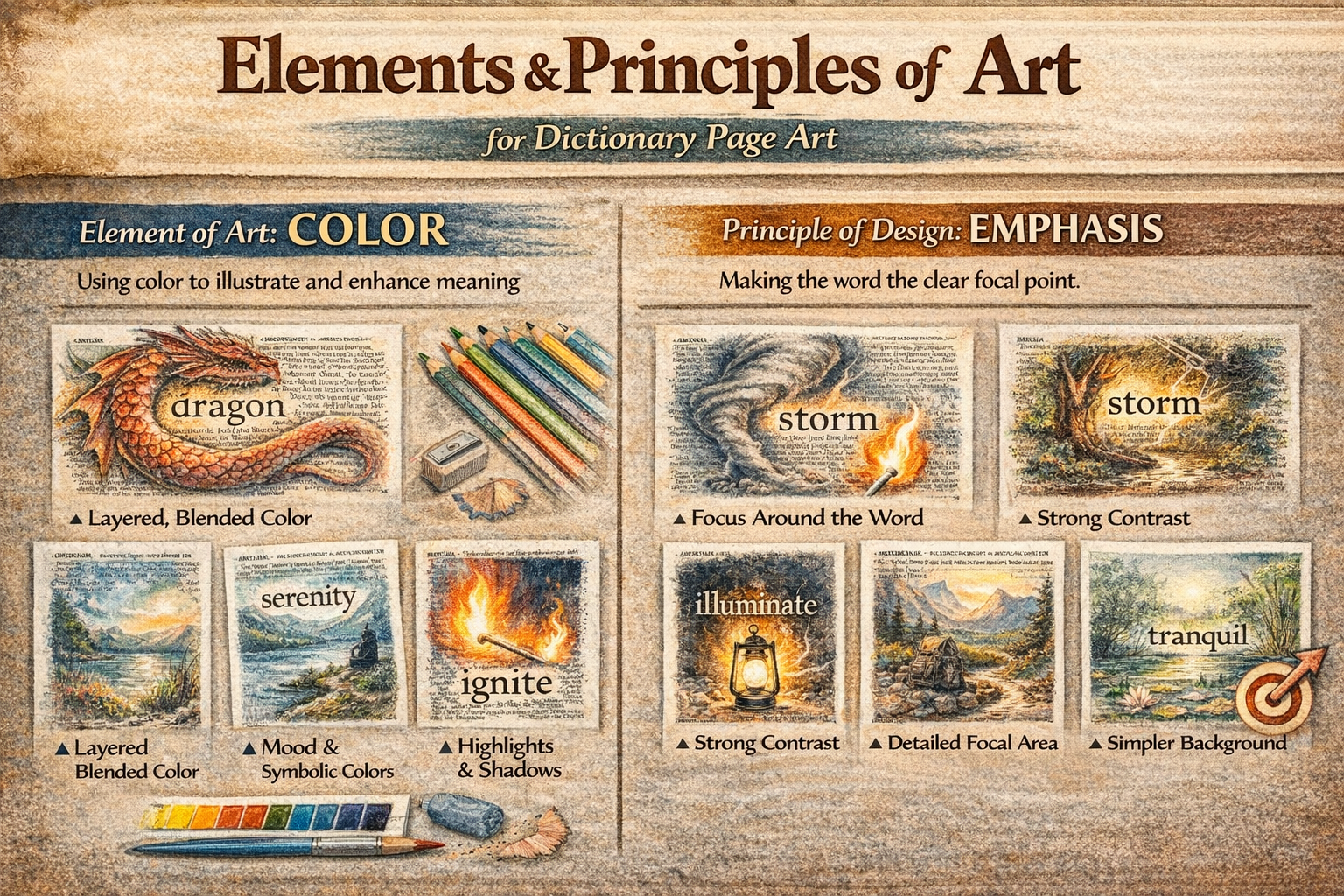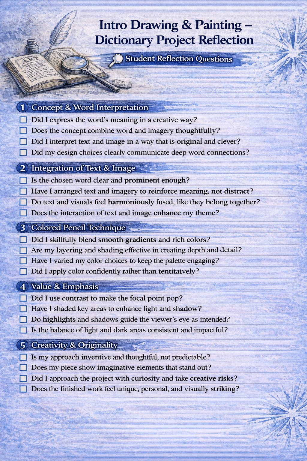 The final artwork should creatively interact with the printed page—allowing the definition and typography to remain visible while enhancing the word through symbolic, literal, or imaginative imagery. This project combines drawing skills with creative thinking and visual storytelling.