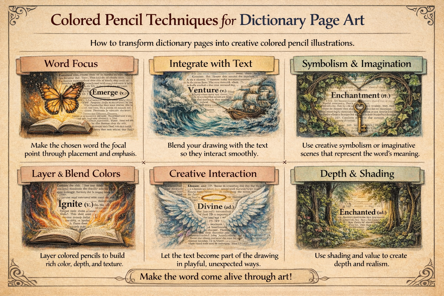 In this conceptual colored pencil project, students will transform a dictionary page into a work of art. Each student will select a word from a removed dictionary page and create an original illustration directly on or around the text that visually represents the meaning of the chosen word.