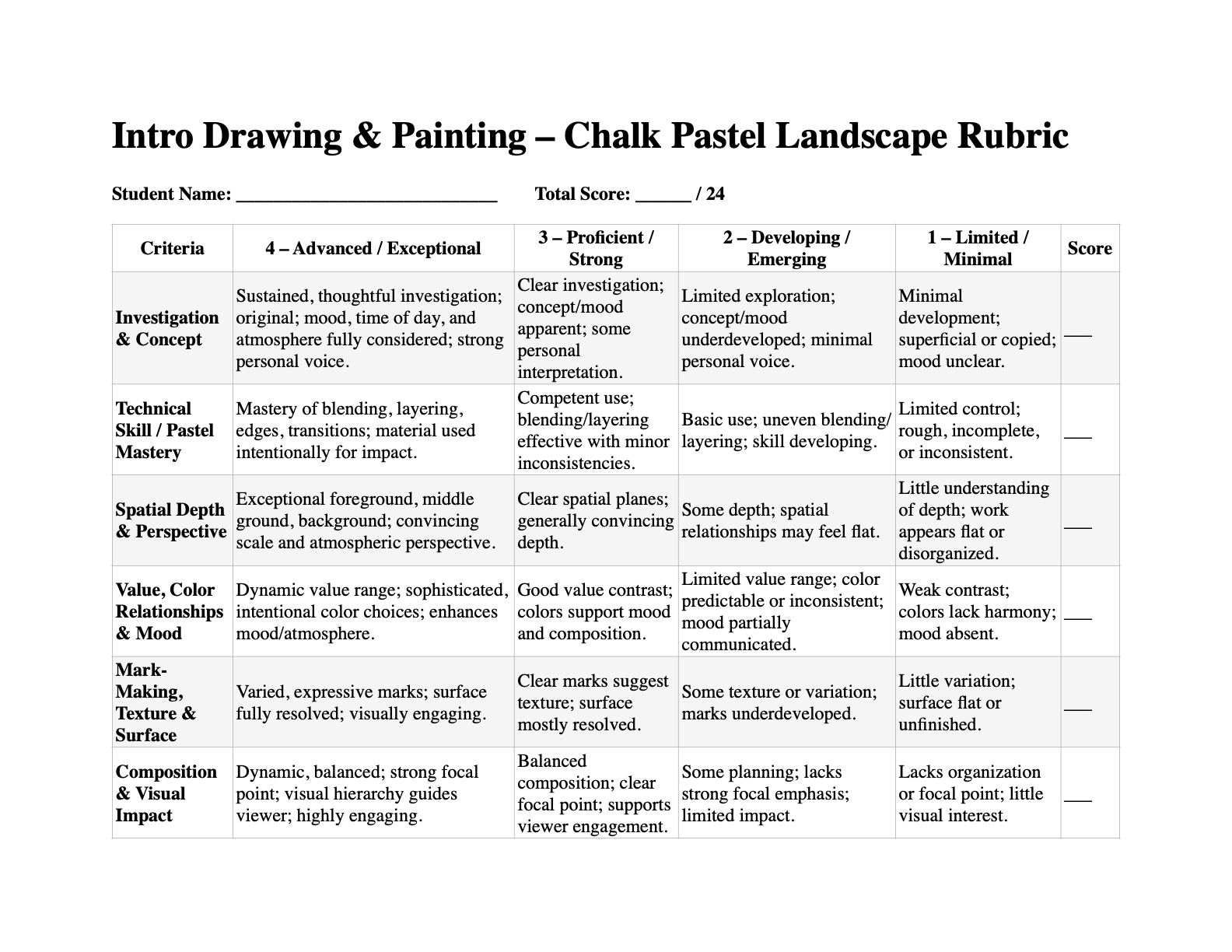 Students use rubric criteria to assess depth, blending quality, contrast, and composition and make revisions as needed.