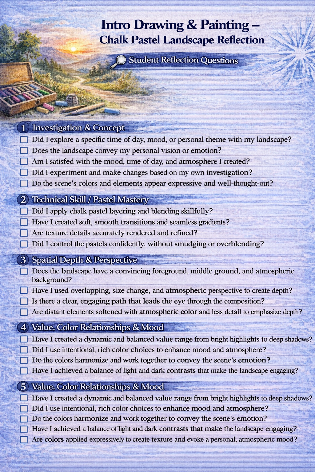 In this chalk pastel landscape project, students will explore how color, layering, and blending can be used to create depth and atmosphere in a natural scene. Using chalk pastels, students will study landscapes—such as mountains, forests, deserts, beaches, or rural settings—and translate their observations into a vibrant, expressive composition.