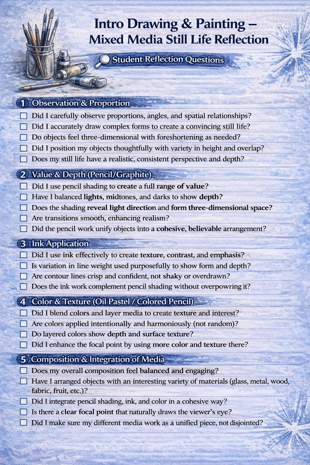 Students are encouraged to experiment with how each material behaves—consider where bold oil pastel marks create emphasis, where delicate colored pencil blending enhances realism, and how ink can guide the viewer’s eye through the composition.