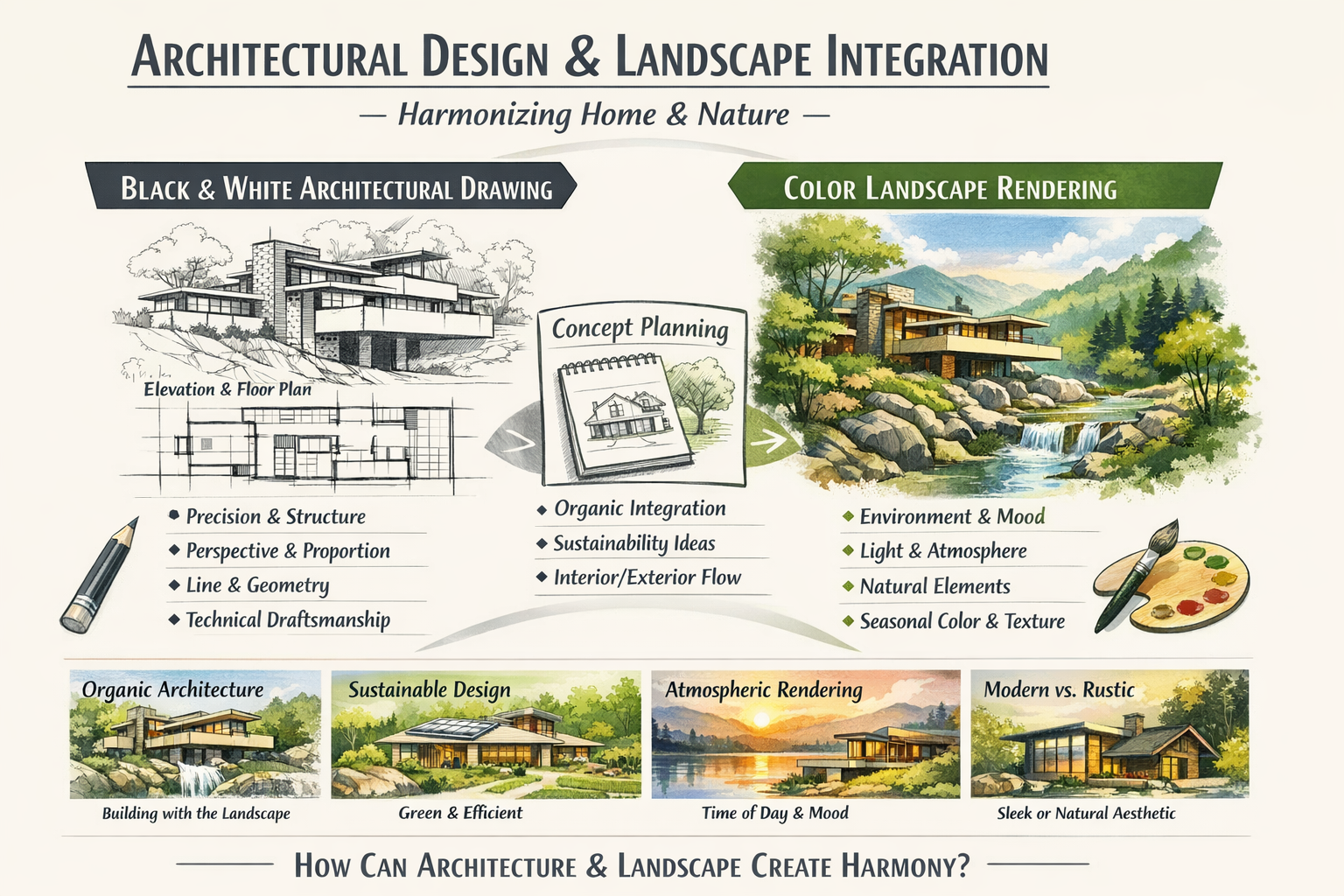 The goal is to create a cohesive design vision where architecture and landscape are intentionally connected rather than separate visual ideas.