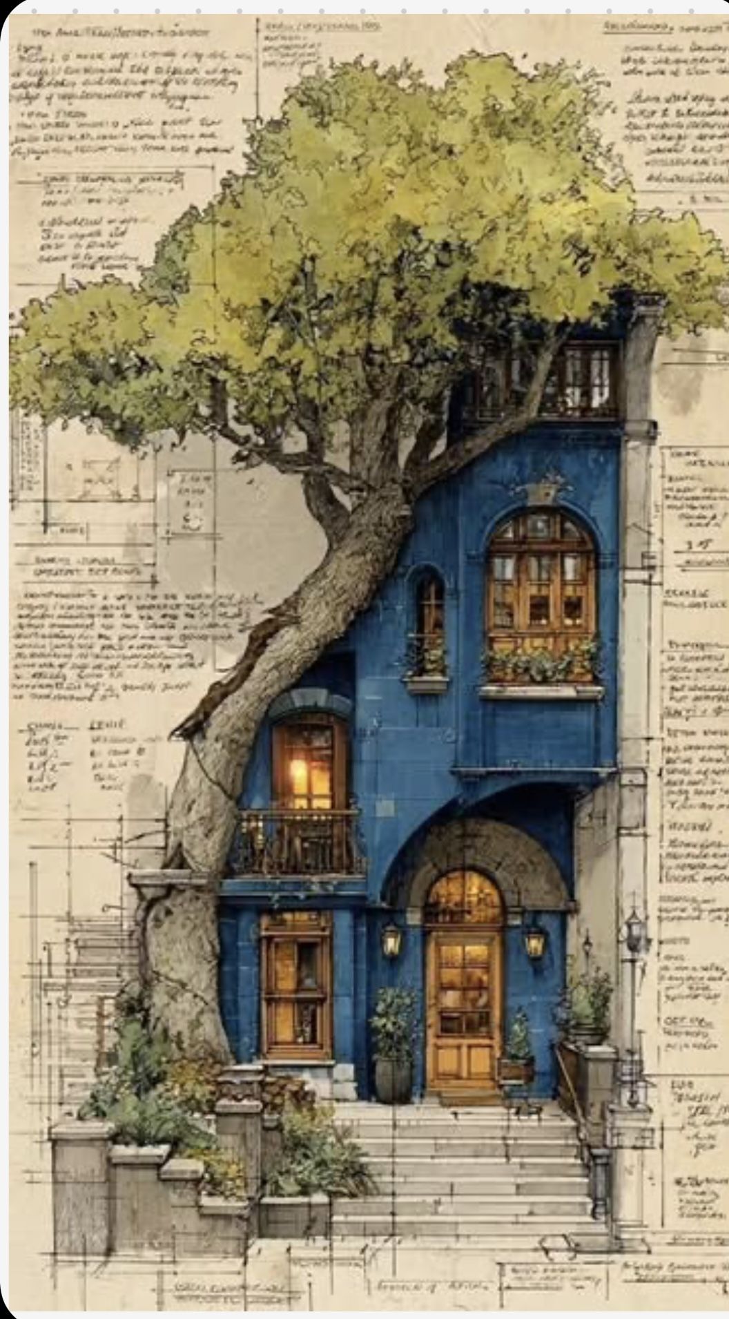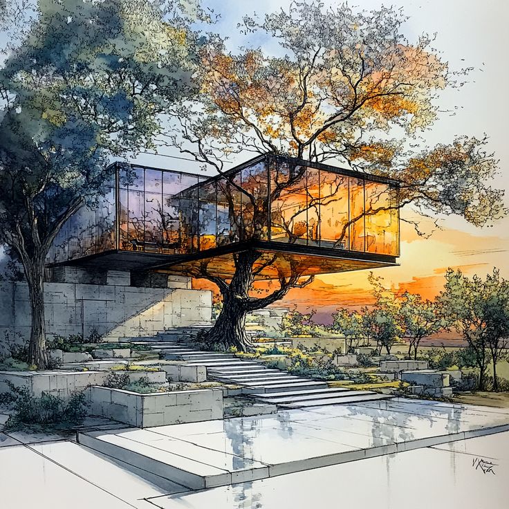 Students will draft floor plans and elevation views in black and white to emphasize clarity, structure, and design logic. In contrast, the landscape drawing will use color to communicate mood, atmosphere, time of day, and environmental integration.