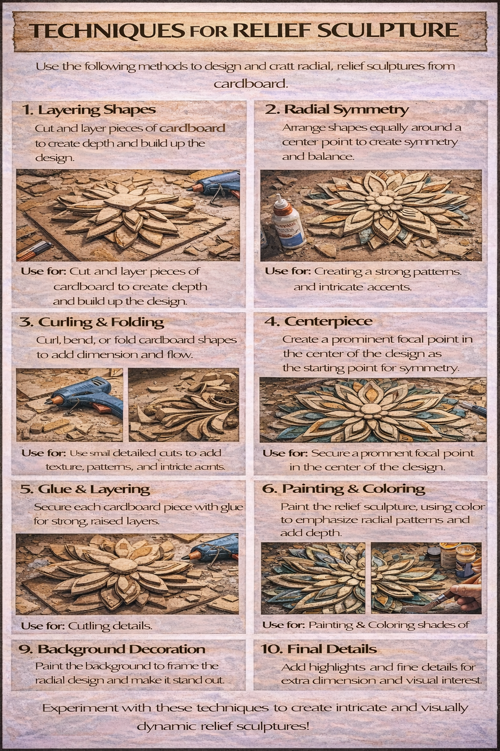 In this project, students will design and create a radial relief sculpture using cardboard as the primary material. By cutting, shaping, layering, and gluing cardboard pieces, students will build a raised (relief) composition that radiates outward from a central point. Once constructed, the sculpture will be enhanced with paint to emphasize depth, contrast, and visual movement.
