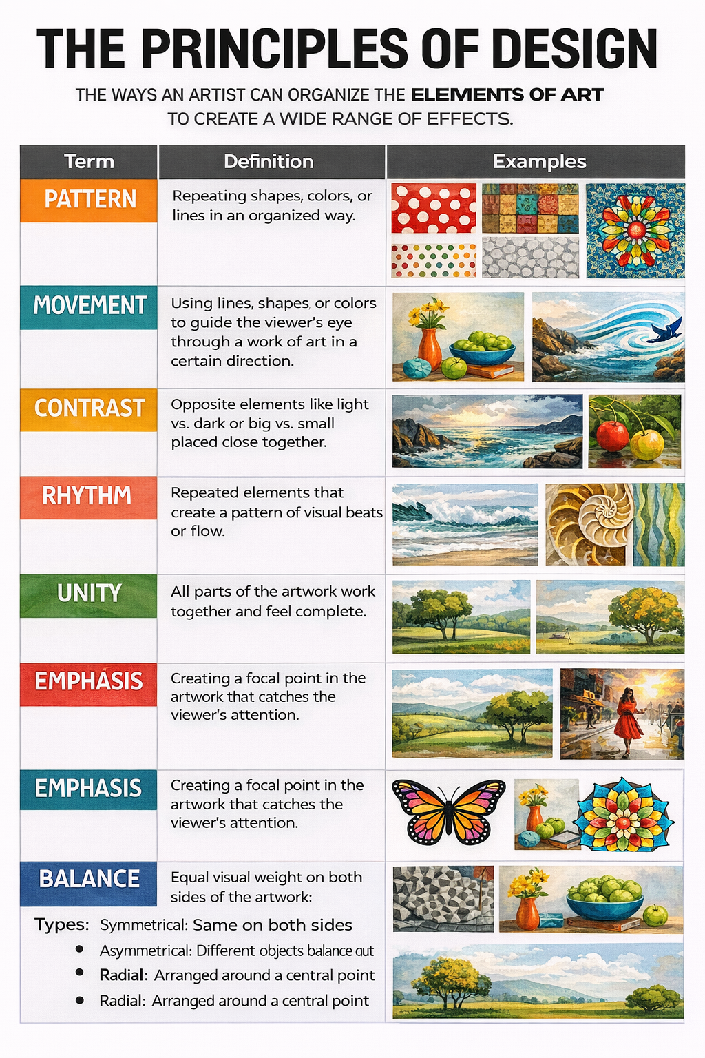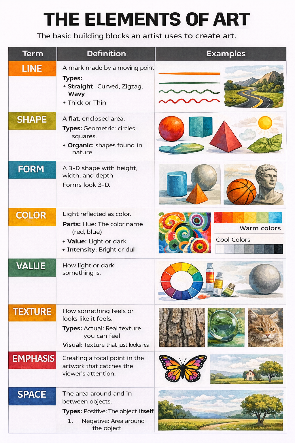 The elements of art are the basic building blocks artists use to create artwork: line, shape, form, color, value, texture, and space. The principles of design are the ways those elements are arranged to make art effective and visually interesting, including balance, contrast, emphasis, movement, pattern, rhythm, unity, and proportion. Together, the elements are the tools, and the principles are the guidelines for using those tools to organize a composition.