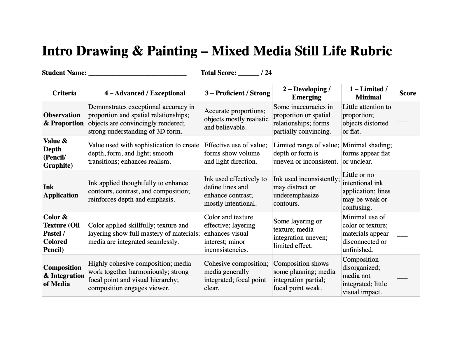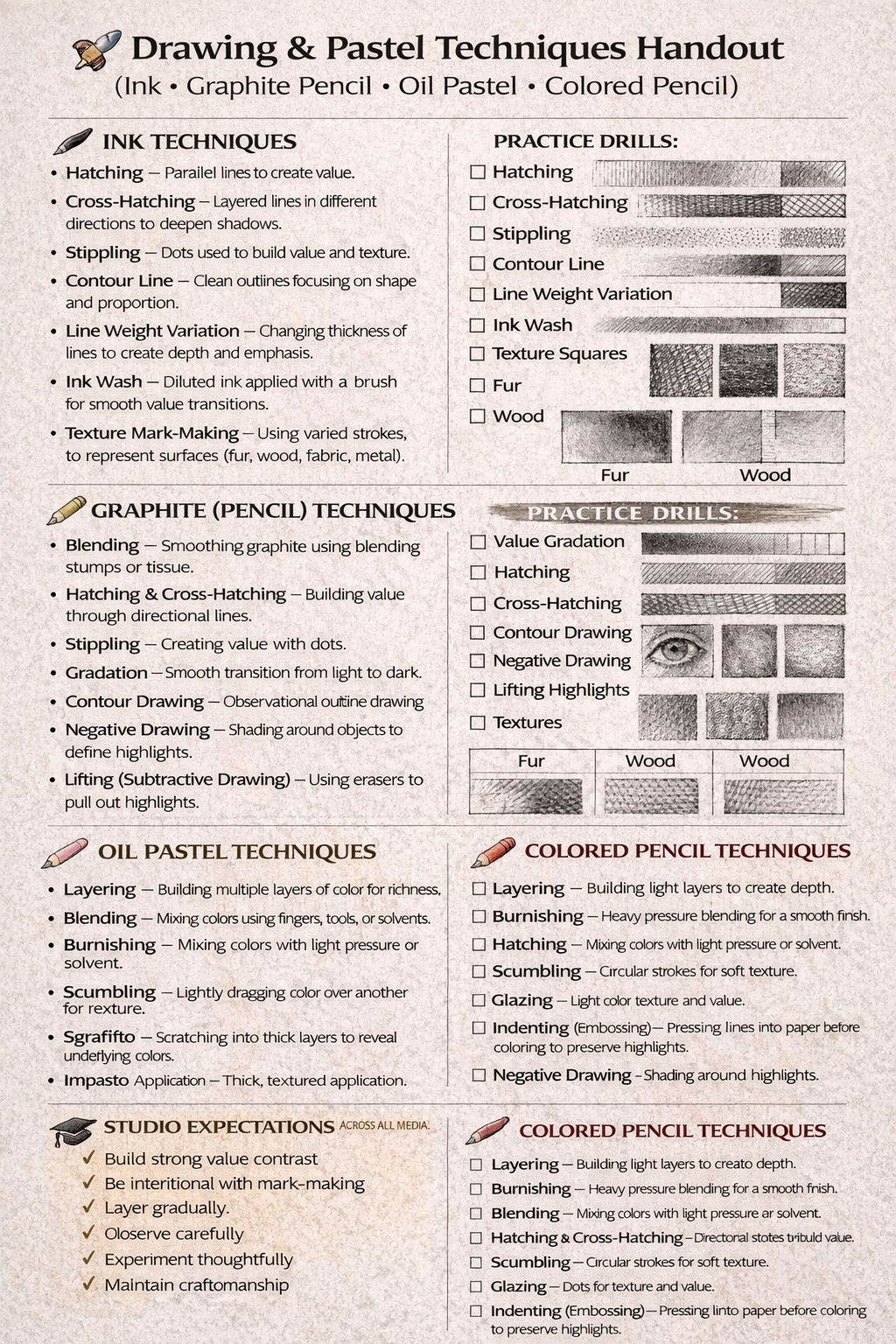 Students are encouraged to experiment with how each material behaves—consider where bold oil pastel marks create emphasis, where delicate colored pencil blending enhances realism, and how ink can guide the viewer’s eye through the composition.