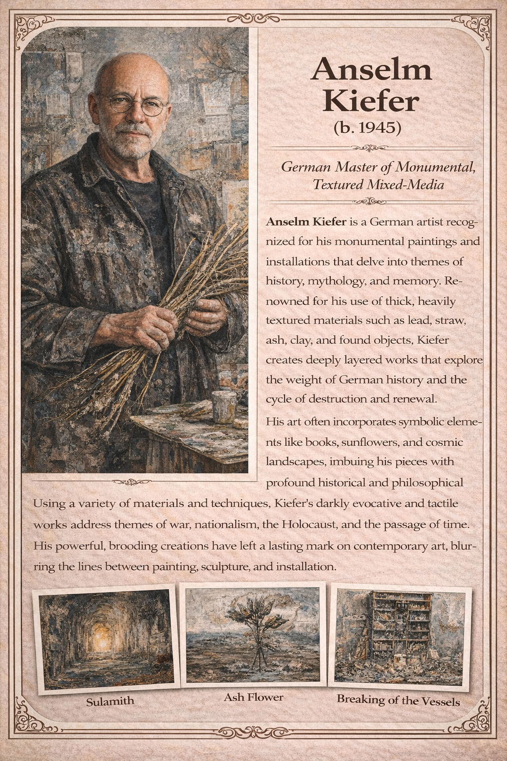 * Anselm Kiefer – Known for incorporating raw materials like straw, lead, and thick impasto surfaces.