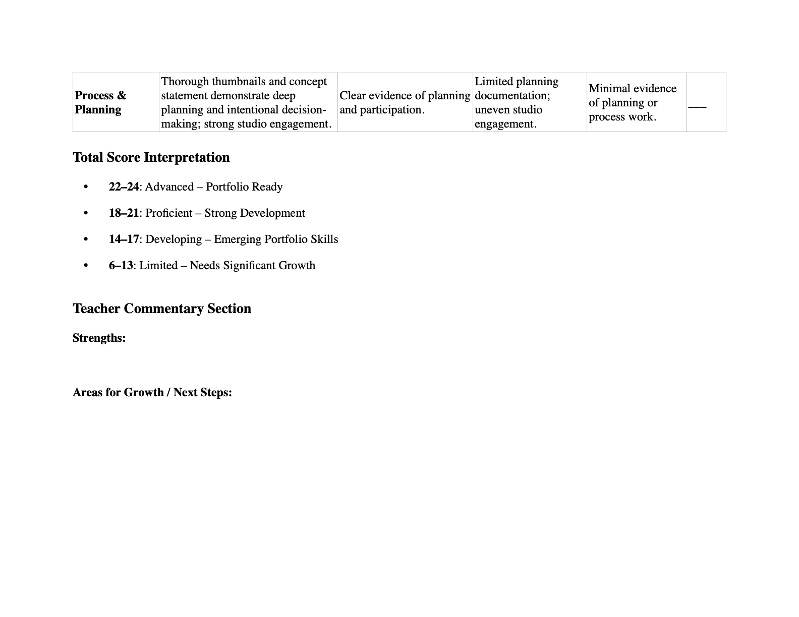 * Effort & Process (10%) – Planning, studio participation, and critique engagement.