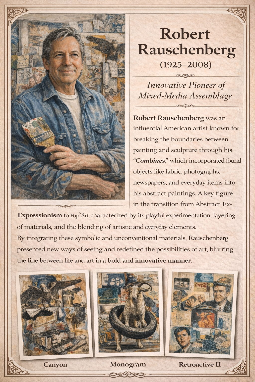 * Robert Rauschenberg – Combined painting and found objects in his “Combines.”