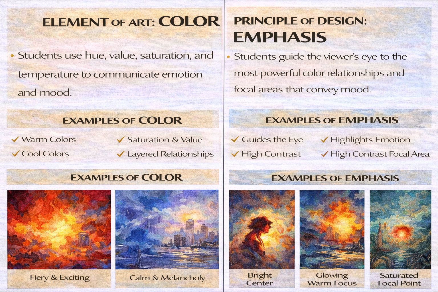 * Students apply color theory (hue, value, saturation, temperature, color schemes) and compositional strategies to plan and create an expressive painting.
