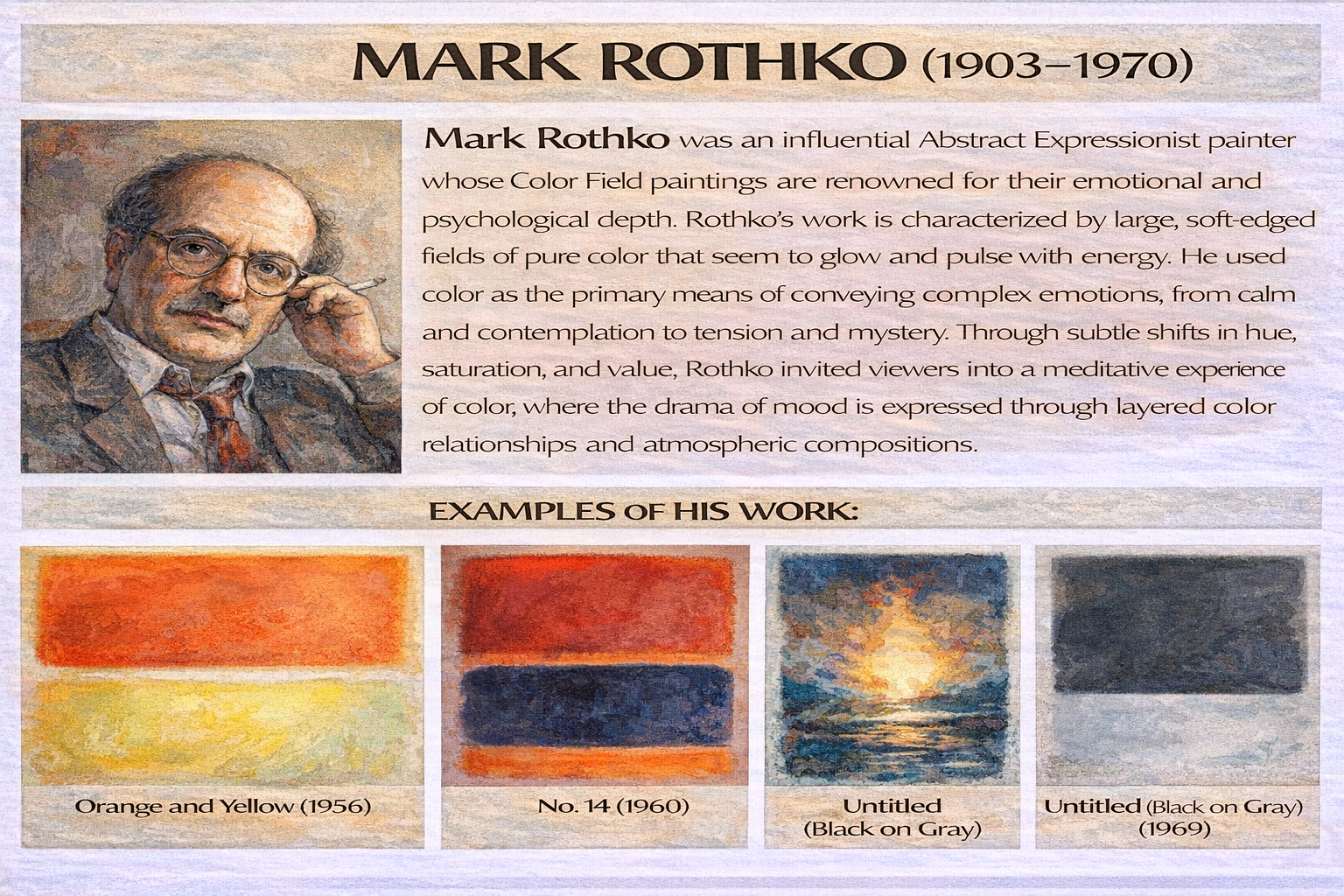 In this assignment, students will create an expressive painting that communicates a specific mood or emotion through intentional use of color. Rather than focusing on realistic representation, students will explore how hue, value, saturation, temperature, and color relationships can evoke psychological and emotional responses from the viewer.