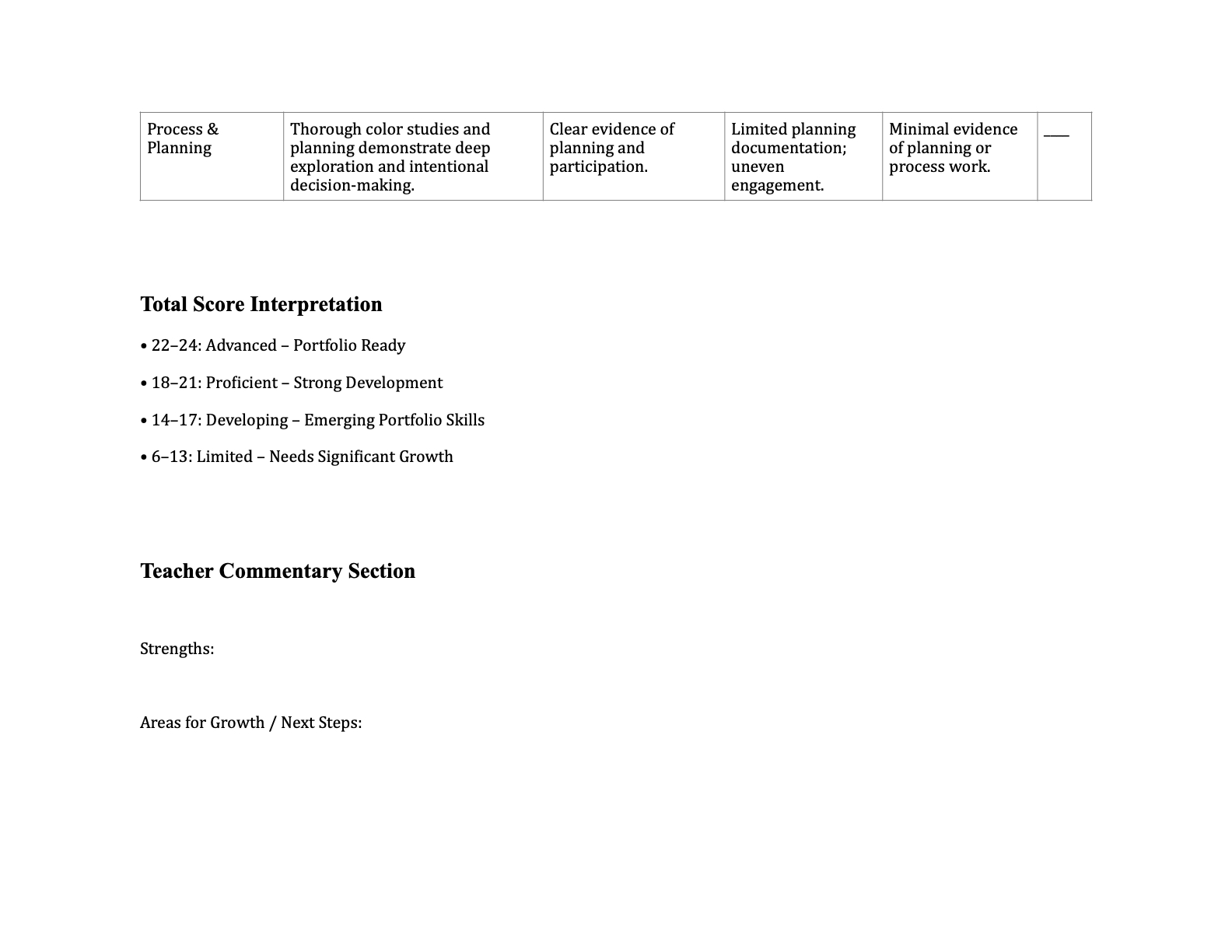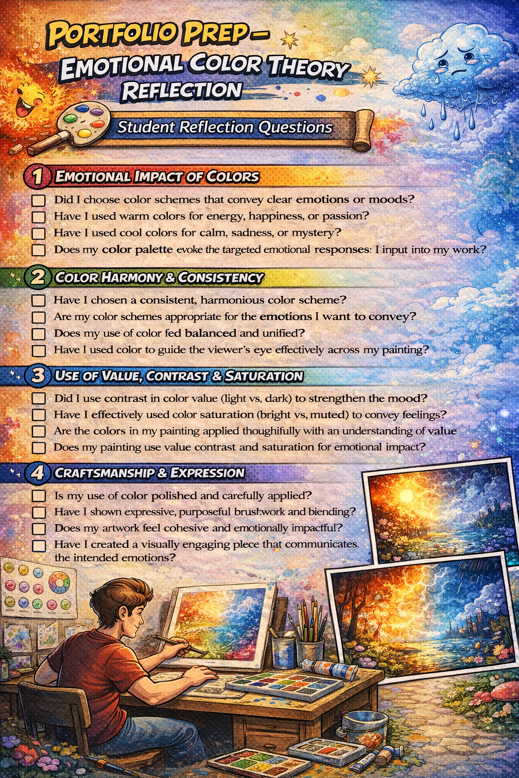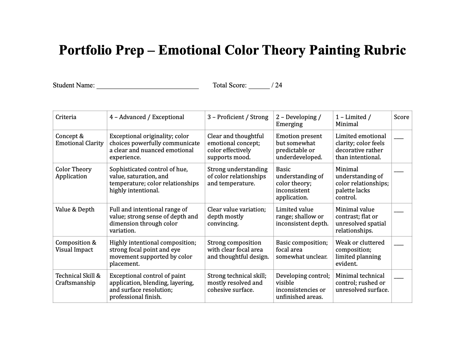* Students use established criteria (emotional clarity, color theory application, craftsmanship, composition) during critique and reflection.