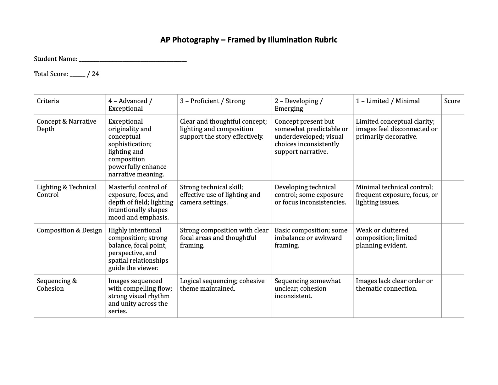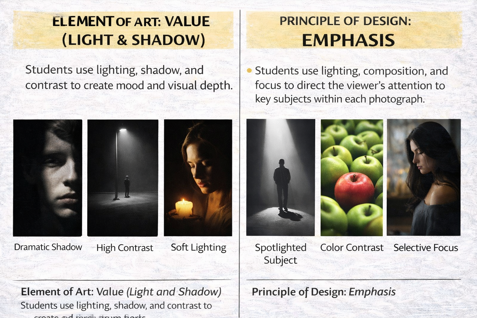 Framed by Illumination emphasizes that photography is not simply about capturing images—it is about constructing meaning. Through deliberate control of light and composition, students will transform individual photographs into a unified visual narrative that engages, challenges, and resonates with the viewer.
