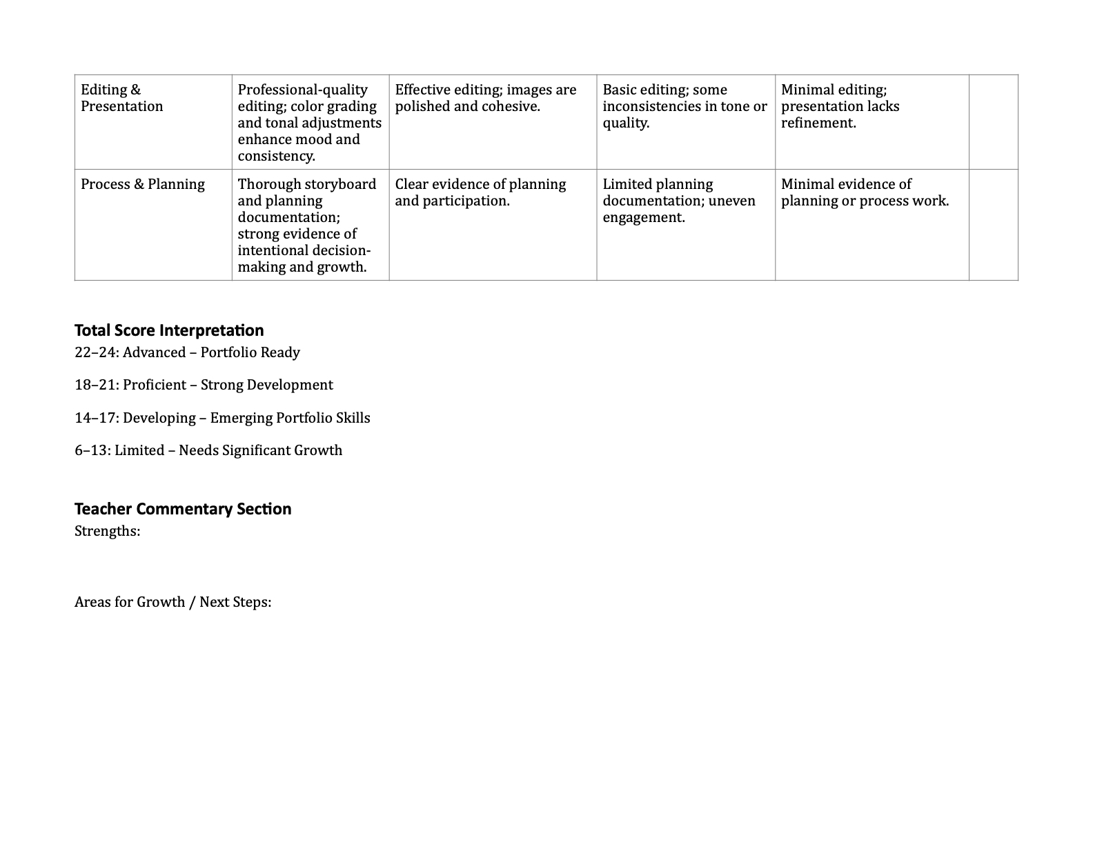 * Reflect on strengths and areas for growth in artistic craft and conceptual development.