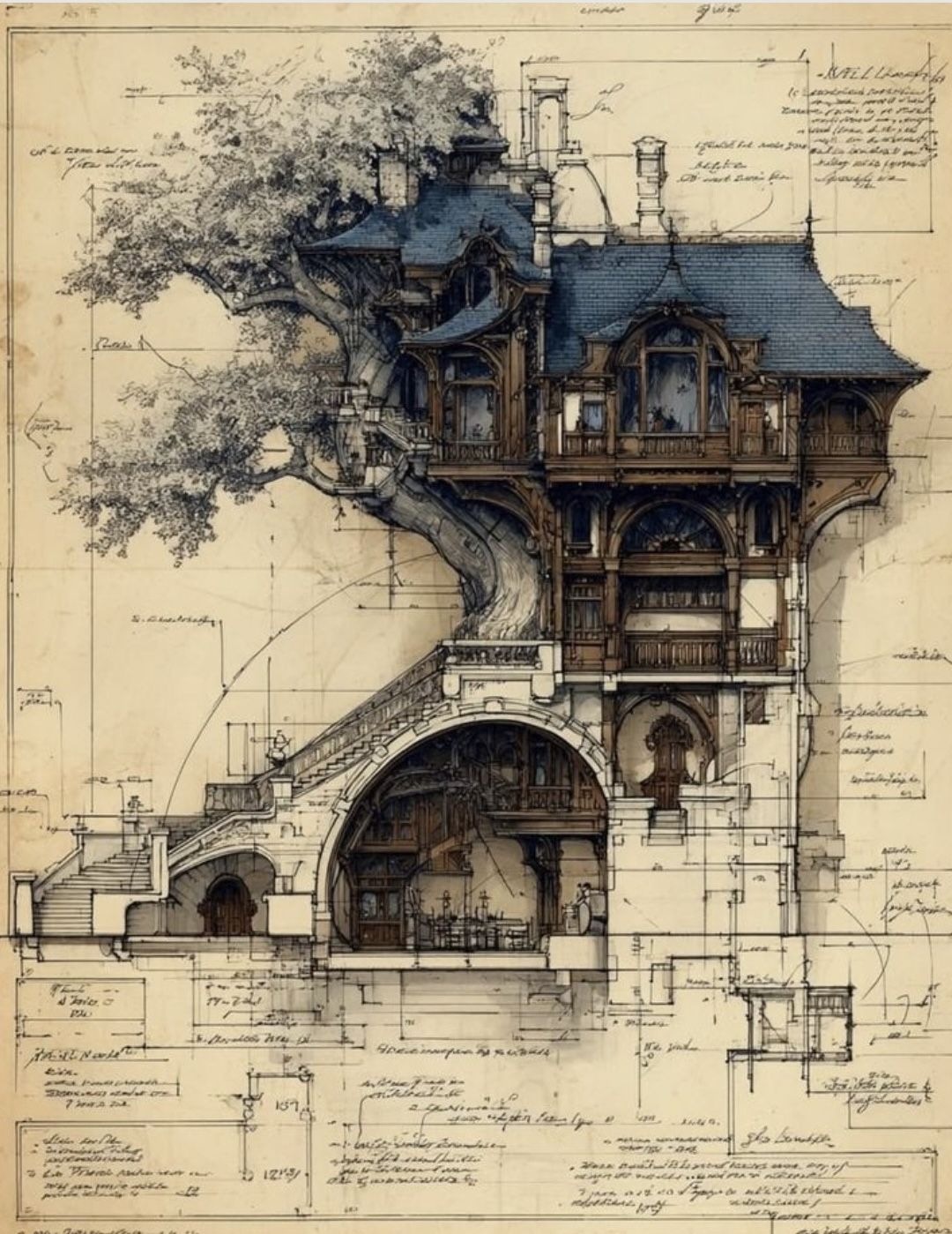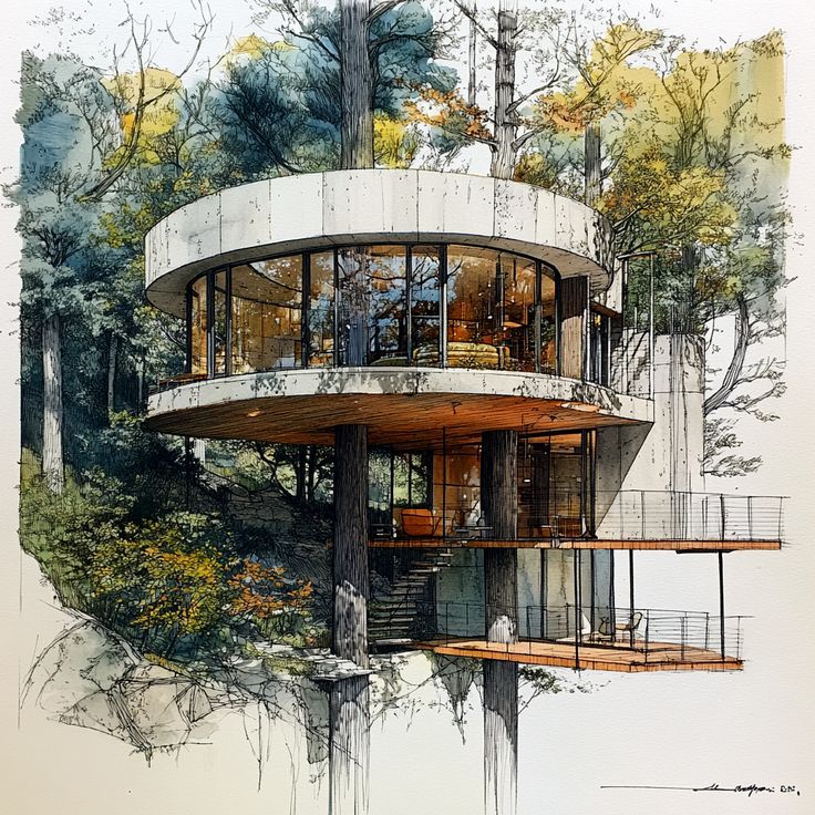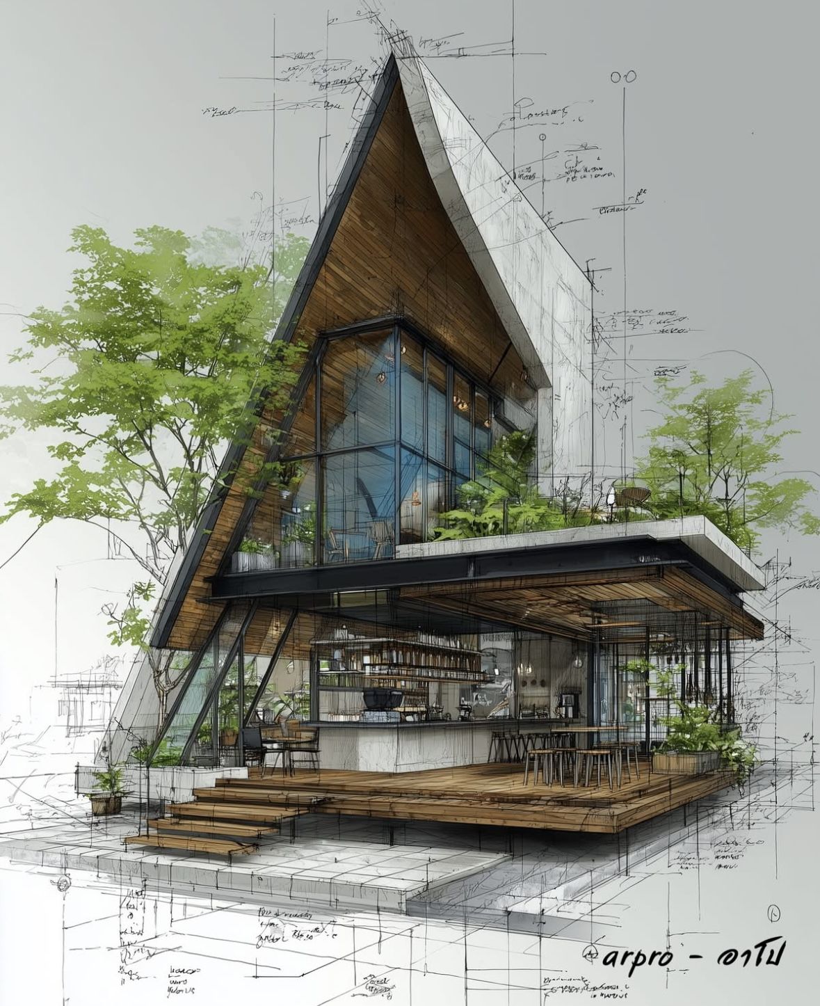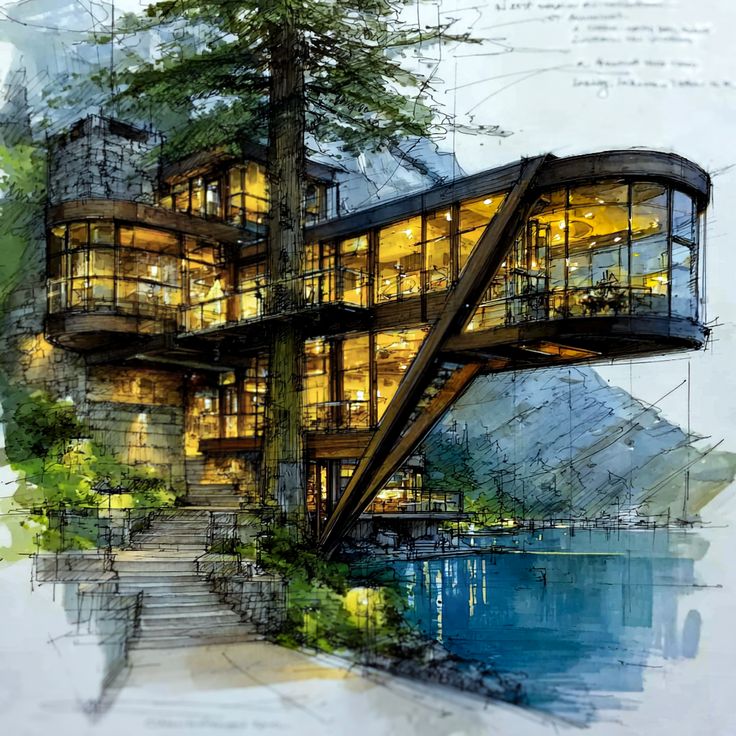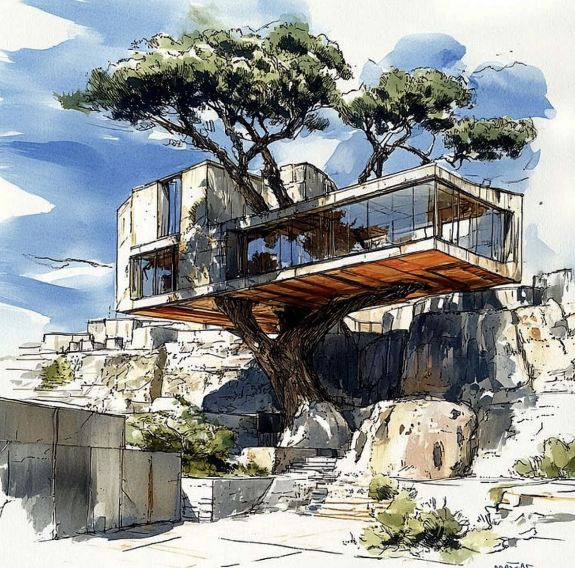 Students will draft floor plans and elevation views in black and white to emphasize clarity, structure, and design logic. In contrast, the landscape drawing will use color to communicate mood, atmosphere, time of day, and environmental integration.