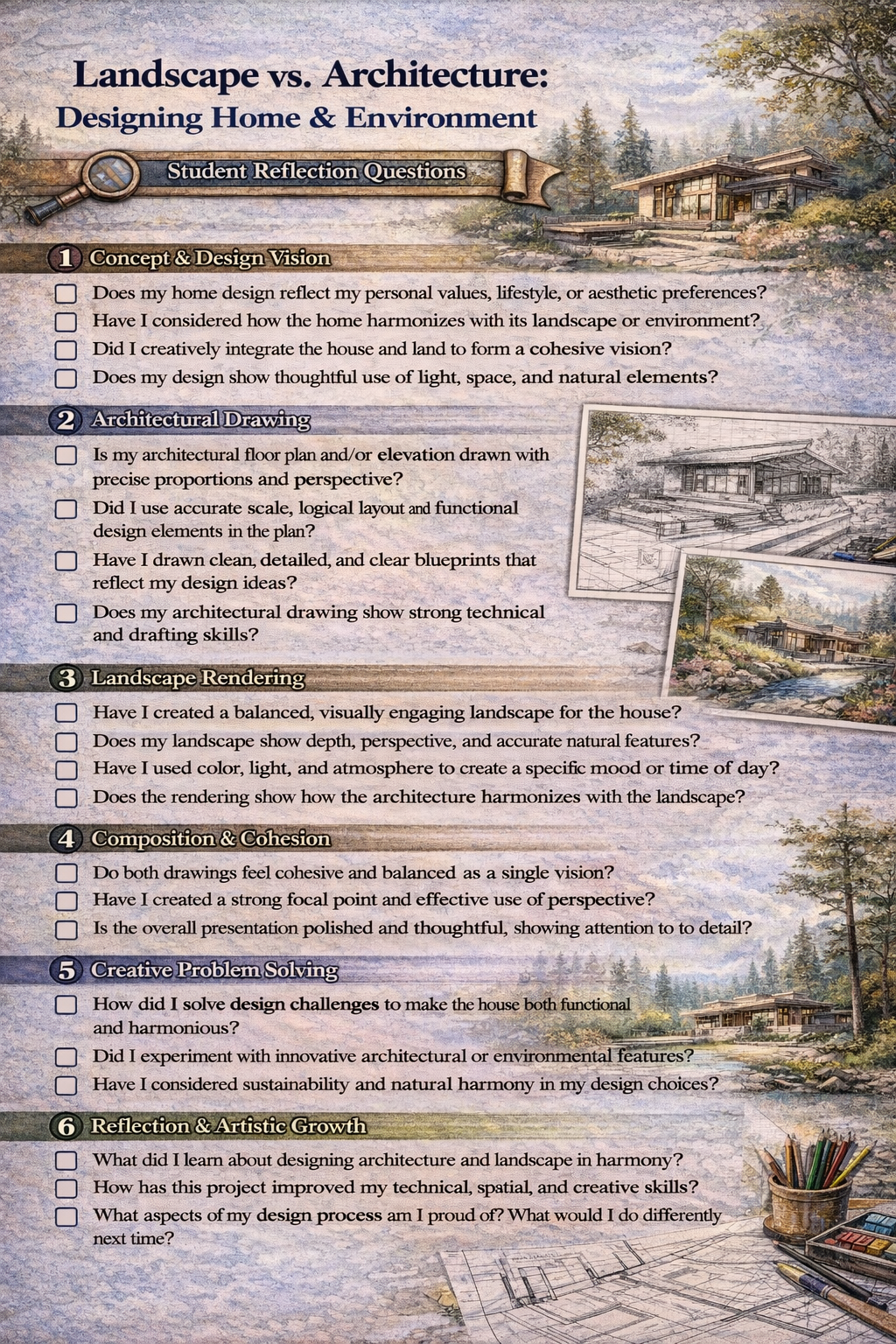 This assignment pushes students beyond observational drawing and into conceptual design. They must consider not only how a house looks, but how it functions, how it relates to land, and how environment shapes human experience.